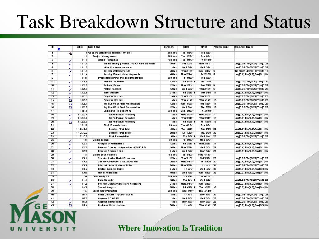 Clients Problem Statement Earned Value Management Task Breakdown Structure and Status Methodology/Technical Approach Issues/Concerns Way Forward Questions Overview