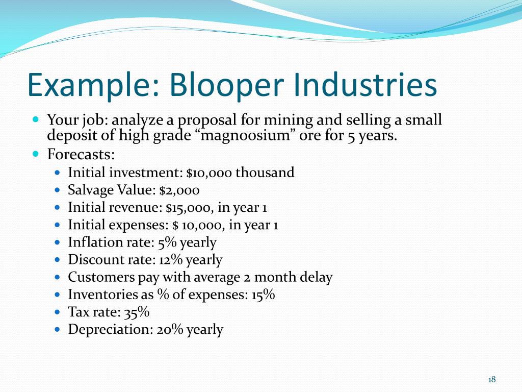 Example: Blooper Industries • Your job: analyze a proposal for mining and selling a small deposit of high grade “magnoosium” ore for 5 years. • Forecasts: • Initial investment: $10,000 thousand • Salvage Value: $2,000 • Initial revenue: $15,000, in year 1 • Initial expenses: $ 10,000, in year 1 • Inflation rate: 5% yearly • Discount rate: 12% yearly • Customers pay with average 2 month delay • Inventories as % of expenses: 15% • Tax rate: 35% • Depreciation: 20% yearly