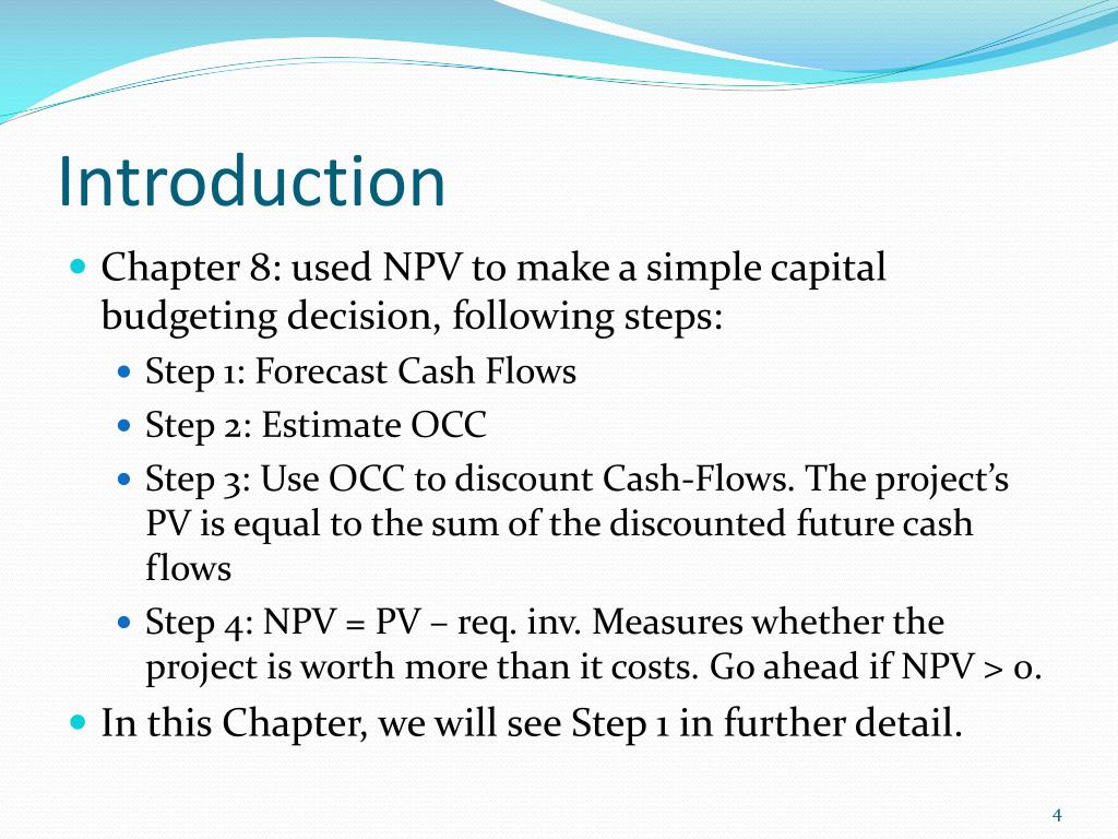 Introduction • Chapter 8: used NPV to make a simple capital budgeting decision, following steps: • Step 1: Forecast Cash Flows • Step 2: Estimate OCC • Step 3: Use OCC to discount Cash-Flows. The project’s PV is equal to the sum of the discounted future cash flows • Step 4: NPV = PV – req. inv. Measures whether the project is worth more than it costs. Go ahead if NPV > 0. • In this Chapter, we will see Step 1 in further detail.