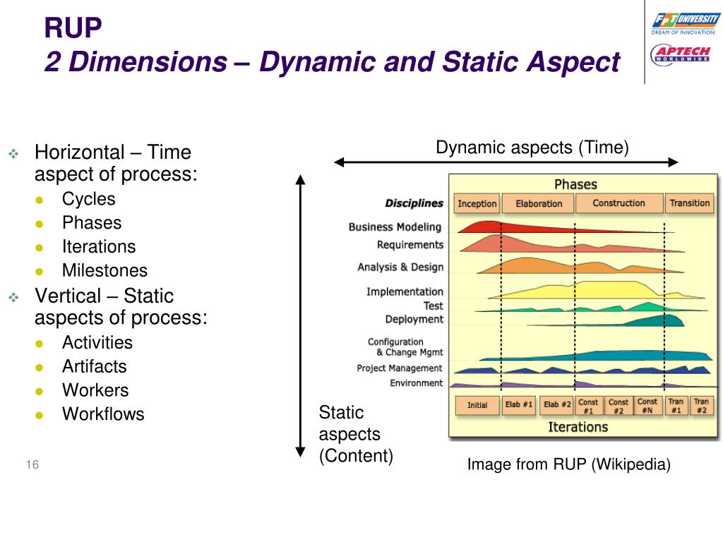 Horizontal – Time aspect of process: Cycles Phases Iterations Milestones Vertical – Static aspects of process: Activities Artifacts Workers Workflows RUP2 Dimensions – Dynamic and Static Aspect Dynamic aspects (Time) Staticaspects (Content) Image from RUP (Wikipedia)