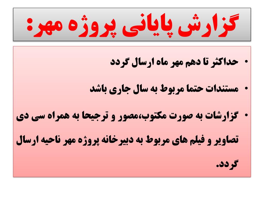 پروژه مهر:گزارش پایانی • حداکثر تا دهم مهر ماه ارسال گردد • مستندات حتما مربوط به سال جاری باشد • گزارشات به صورت مکتوب،مصور و ترجیحا به همراه سی دی تصاویر و فیلم های مربوط به دبیرخانه پروژه مهر ناحیه ارسال گردد.