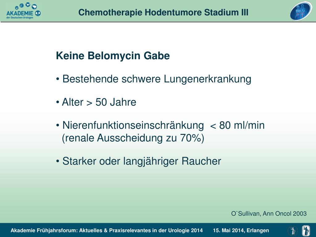 Chemotherapie Hodentumore Stadium III • Keine Belomycin Gabe • Bestehende schwere Lungenerkrankung • Alter > 50 Jahre • Nierenfunktionseinschränkung < 80 ml/min • (renale Ausscheidung zu 70%) • Starker oder langjähriger Raucher O`Sullivan, Ann Oncol 2003