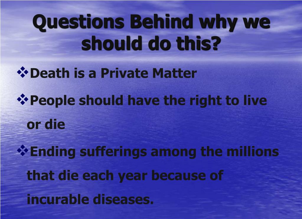 Questions Behind why we should do this? • Death is a Private Matter • People should have the right to live or die • Ending sufferings among the millions that die each year because of incurable diseases.