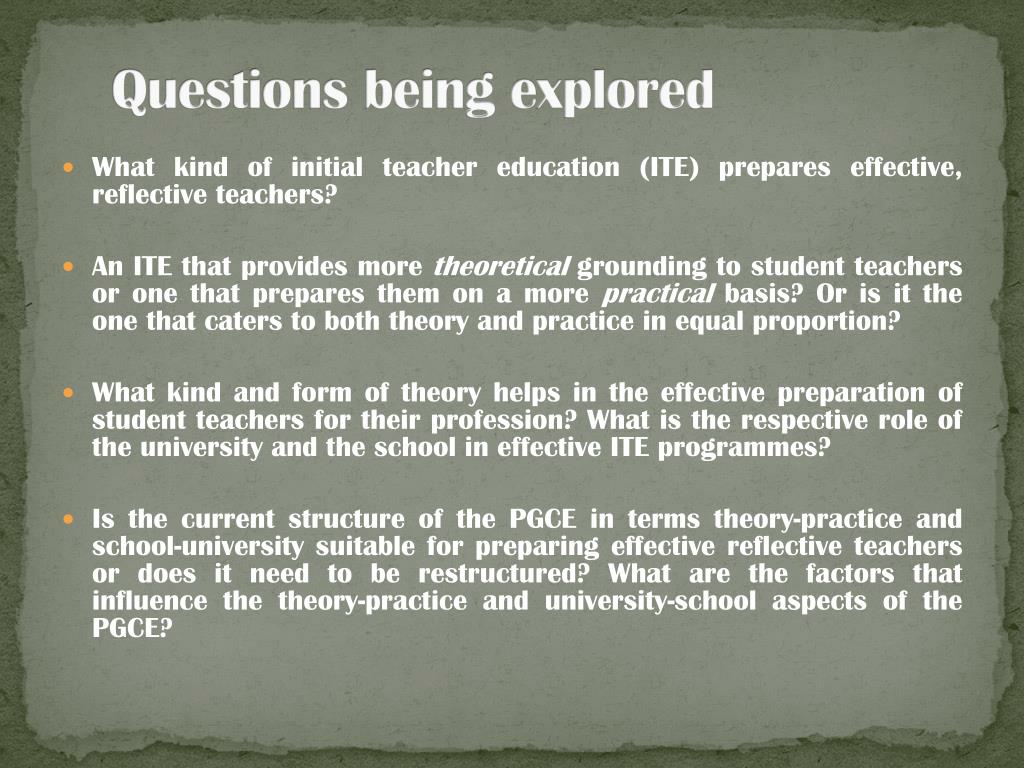 Questions being explored • What kind of initial teacher education (ITE) prepares effective, reflective teachers? • An ITE that provides more theoretical grounding to student teachers or one that prepares them on a more practical basis? Or is it the one that caters to both theory and practice in equal proportion? • What kind and form of theory helps in the effective preparation of student teachers for their profession? What is the respective role of the university and the school in effective ITE programmes? • Is the current structure of the PGCE in terms theory-practice and school-university suitable for preparing effective reflective teachers or does it need to be restructured? What are the factors that influence the theory-practice and university-school aspects of the PGCE?