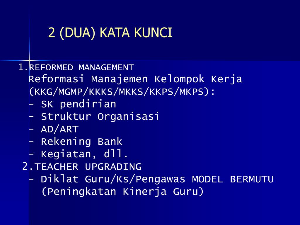 2 (DUA) KATA KUNCI 1.REFORMED MANAGEMENT Reformasi Manajemen KelompokKerja (KKG/MGMP/KKKS/MKKS/KKPS/MKPS): - SK pendirian - Struktur Organisasi - AD/ART - Rekening Bank - Kegiatan, dll. 2.TEACHER UPGRADING - Diklat Guru/Ks/Pengawas MODEL BERMUTU (Peningkatan Kinerja Guru)