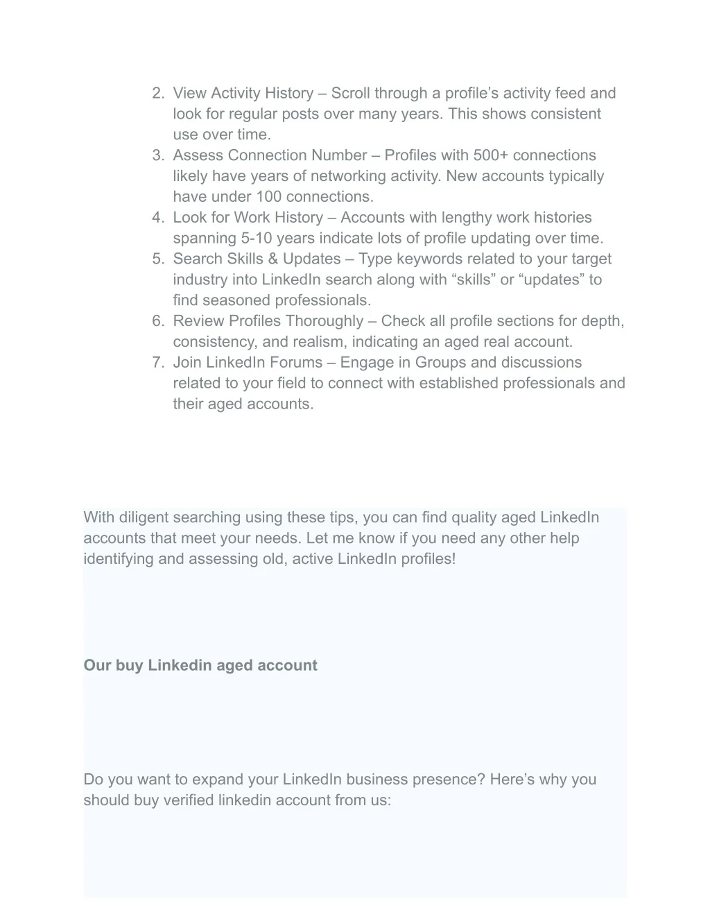 2. View Activity History – Scroll through a profile’s activity feed and look for regular posts over many years. This shows consistent use over time. 3. Assess Connection Number – Profiles with 500+ connections likely have years of networking activity. New accounts typically have under 100 connections. 4. Look for Work History – Accounts with lengthy work histories spanning 5-10 years indicate lots of profile updating over time. 5. Search Skills & Updates – Type keywords related to your target industry into LinkedIn search along with “skills” or “updates” to find seasoned professionals. 6. Review Profiles Thoroughly – Check all profile sections for depth, consistency, and realism, indicating an aged real account. 7. Join LinkedIn Forums – Engage in Groups and discussions related to your field to connect with established professionals and their aged accounts. With diligent searching using these tips, you can find quality aged LinkedIn accounts that meet your needs. Let me know if you need any other help identifying and assessing old, active LinkedIn profiles! Our buy Linkedin aged account Do you want to expand your LinkedIn business presence? Here’s why you should buy verified linkedin account from us: