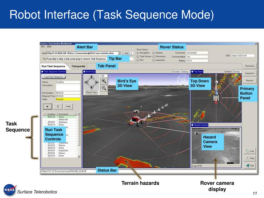 Robot Interface (Task Sequence Mode) Task Sequence Terrain hazards Rover camera display