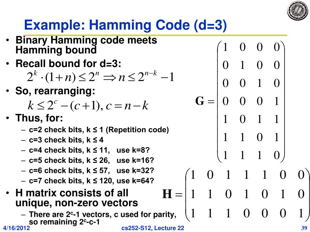 Example: Hamming Code (d=3) • Binary Hamming code meets Hamming bound • Recall bound for d=3: • So, rearranging: • Thus, for: • c=2 check bits, k ≤ 1 (Repetition code) • c=3 check bits, k ≤ 4 • c=4 check bits, k ≤ 11, use k=8? • c=5 check bits, k ≤ 26, use k=16? • c=6 check bits, k ≤ 57, use k=32? • c=7 check bits, k ≤ 120, use k=64? • H matrix consists of all unique, non-zero vectors • There are 2c-1 vectors, c used for parity, so remaining 2c-c-1