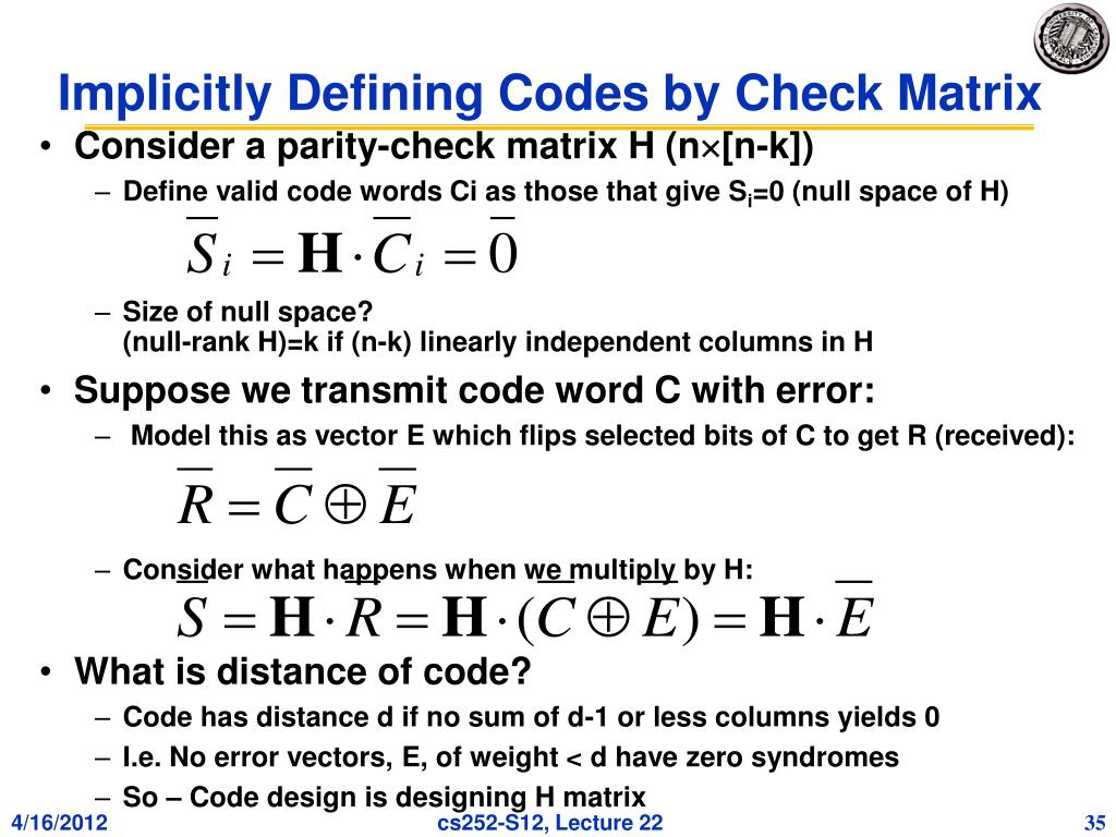 Implicitly Defining Codes by Check Matrix • Consider a parity-check matrix H (n[n-k]) • Define valid code words Ci as those that give Si=0 (null space of H) • Size of null space? (null-rank H)=k if (n-k) linearly independent columns in H • Suppose we transmit code word C with error: • Model this as vector E which flips selected bits of C to get R (received): • Consider what happens when we multiply by H: • What is distance of code? • Code has distance d if no sum of d-1 or less columns yields 0 • I.e. No error vectors, E, of weight < d have zero syndromes • So – Code design is designing H matrix