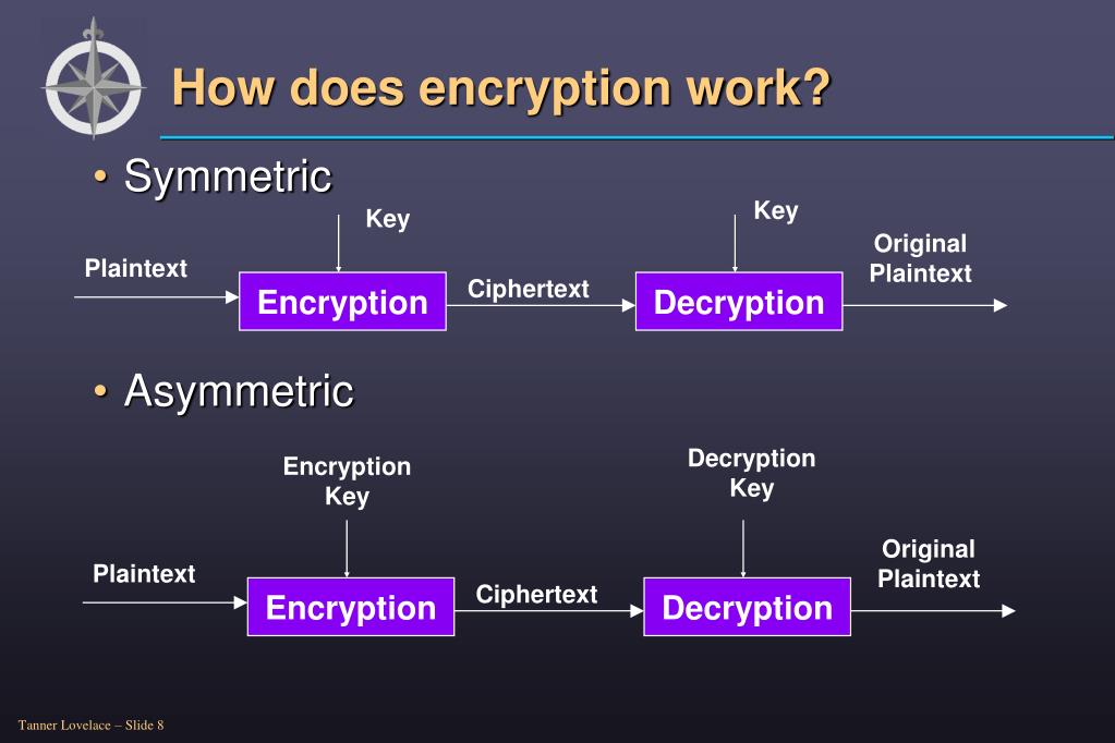 Symmetric Key Key Original Plaintext Plaintext Ciphertext Encryption Decryption • Asymmetric Decryption Key Encryption Key Original Plaintext Plaintext Ciphertext Encryption Decryption How does encryption work?