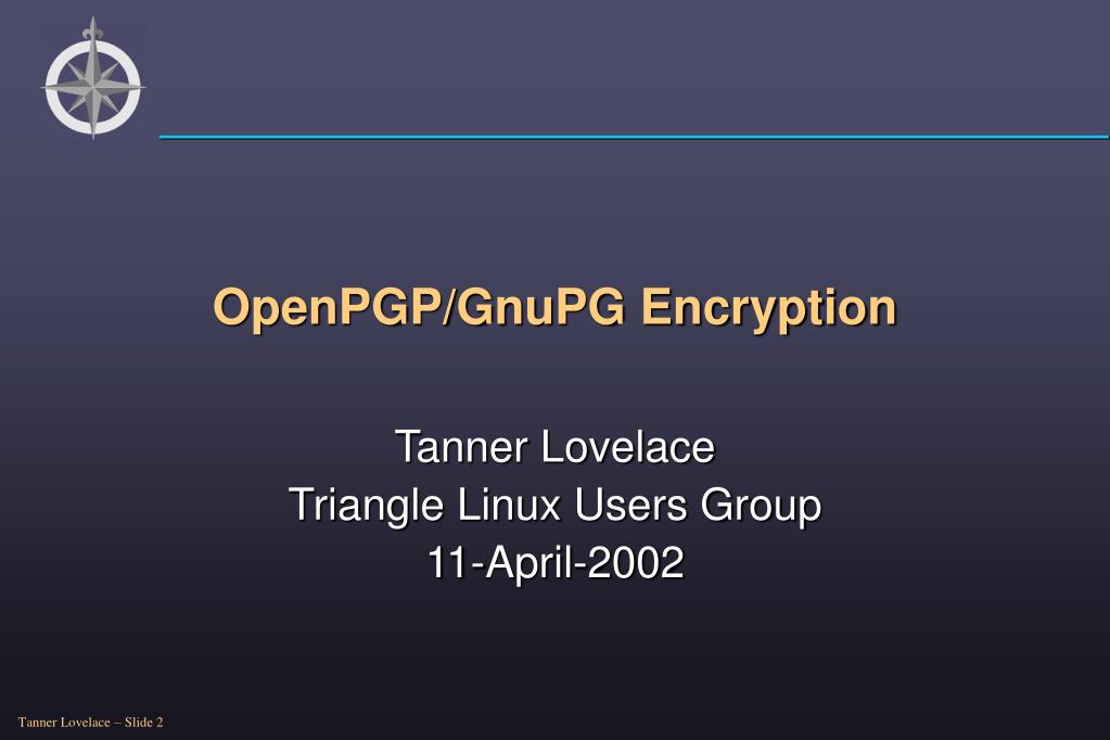 OpenPGP/GnuPG Encryption Tanner Lovelace Triangle Linux Users Group 11-April-2002