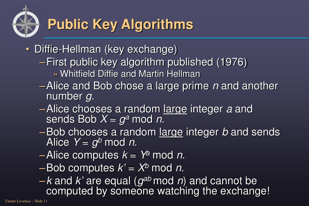 Public Key Algorithms • Diffie-Hellman (key exchange) • First public key algorithm published (1976) • Whitfield Diffie and Martin Hellman • Alice and Bob chose a large prime n and another number g. • Alice chooses a random large integer a and sends Bob X = ga mod n. • Bob chooses a random large integer b and sends Alice Y = gb mod n. • Alice computes k = Yamod n. • Bob computes k’ = Xbmod n. • k and k’ are equal (gab mod n) and cannot be computed by someone watching the exchange!
