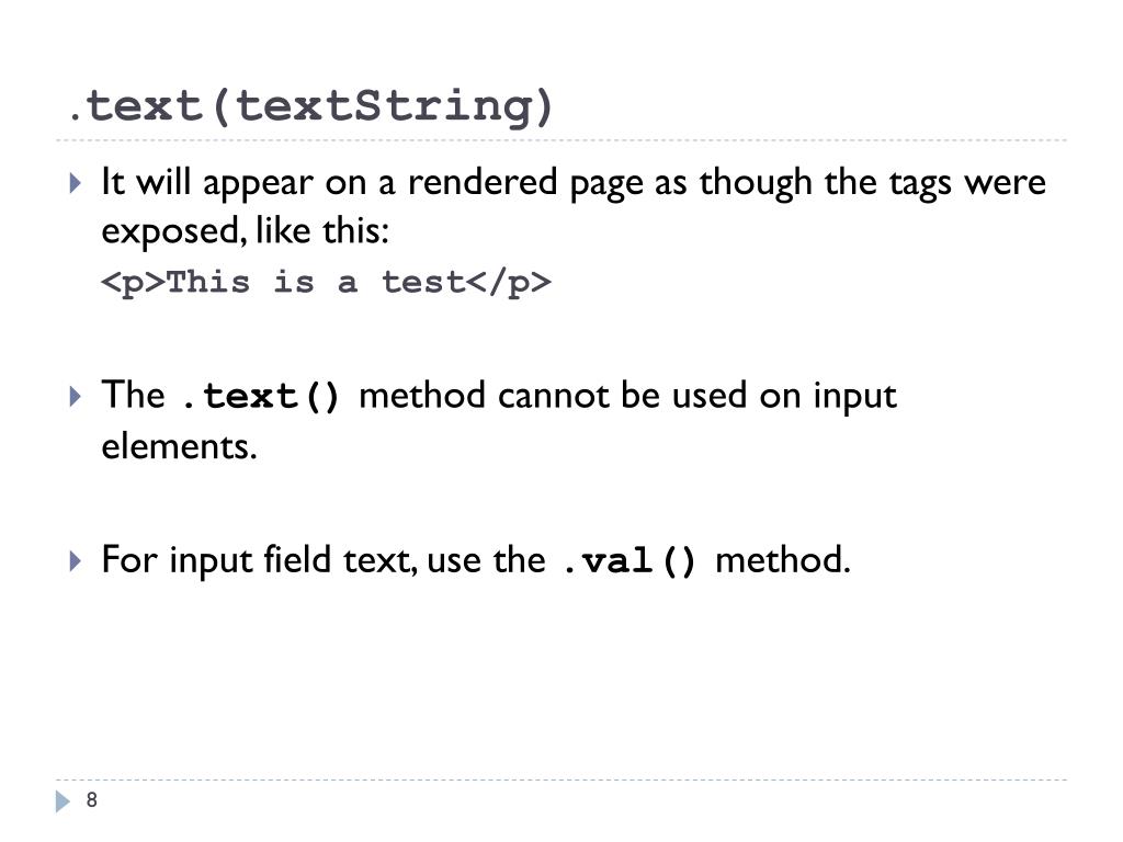 .text(textString) • It will appear on a rendered page as though the tags were exposed, like this: <p>This is a test</p> • The .text() method cannot be used on input elements. • For input field text, use the .val() method.