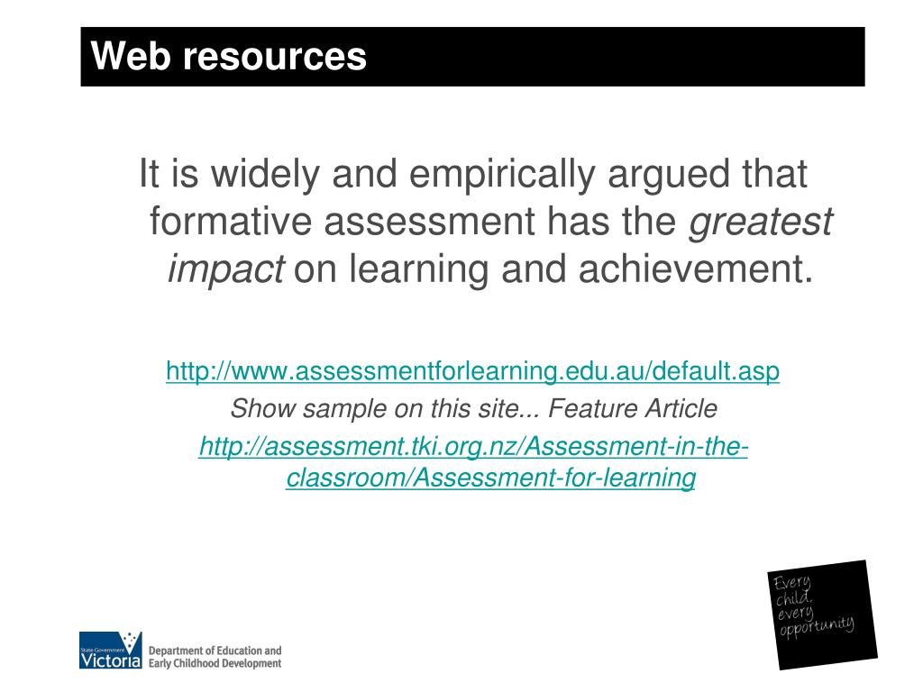 Web resources It is widely and empirically argued that formative assessment has the greatest impact on learning and achievement. http://www.assessmentforlearning.edu.au/default.asp Show sample on this site... Feature Article http://assessment.tki.org.nz/Assessment-in-the-classroom/Assessment-for-learning