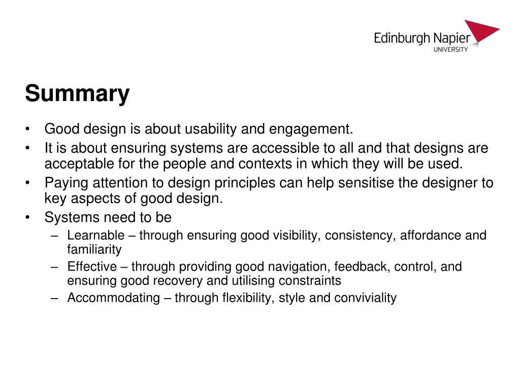 Summary • Good design is about usability and engagement. • It is about ensuring systems are accessible to all and that designs are acceptable for the people and contexts in which they will be used. • Paying attention to design principles can help sensitise the designer to key aspects of good design. • Systems need to be • Learnable – through ensuring good visibility, consistency, affordance and familiarity • Effective – through providing good navigation, feedback, control, and ensuring good recovery and utilising constraints • Accommodating – through flexibility, style and conviviality