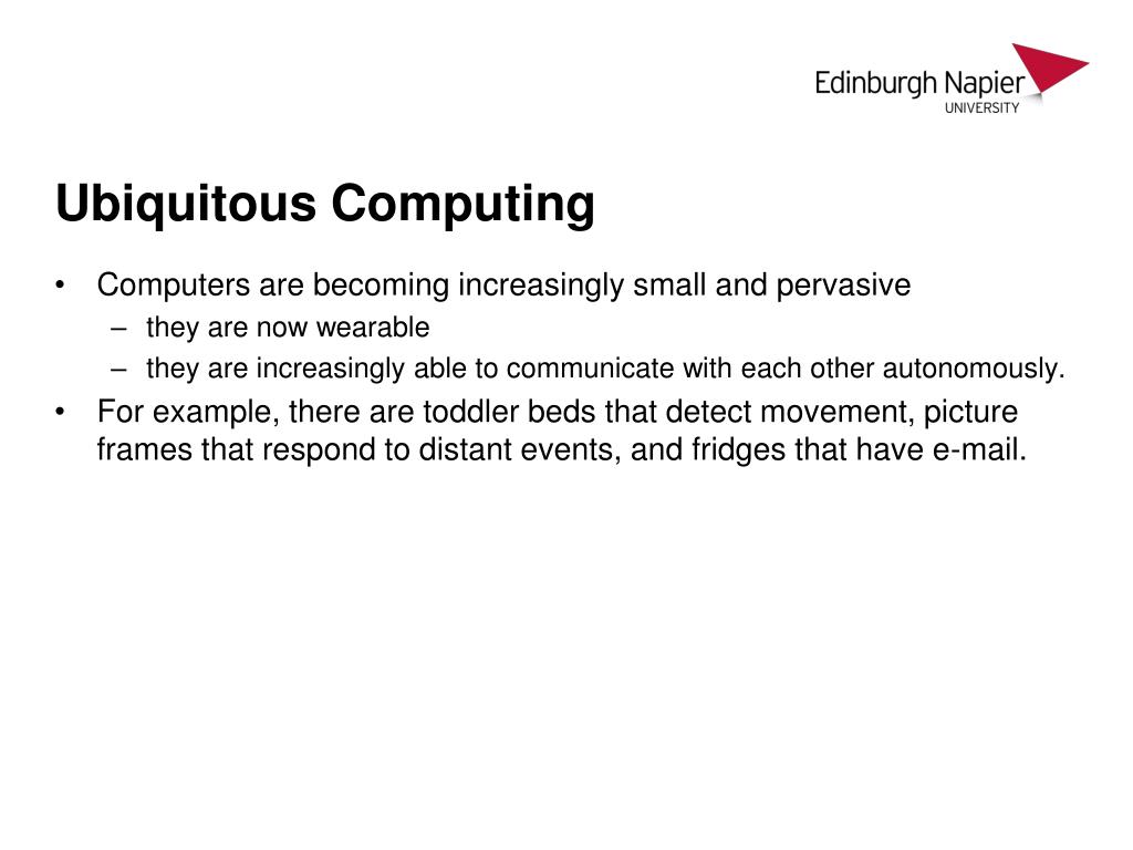 Ubiquitous Computing • Computers are becoming increasingly small and pervasive • they are now wearable • they are increasingly able to communicate with each other autonomously. • For example, there are toddler beds that detect movement, picture frames that respond to distant events, and fridges that have e-mail.