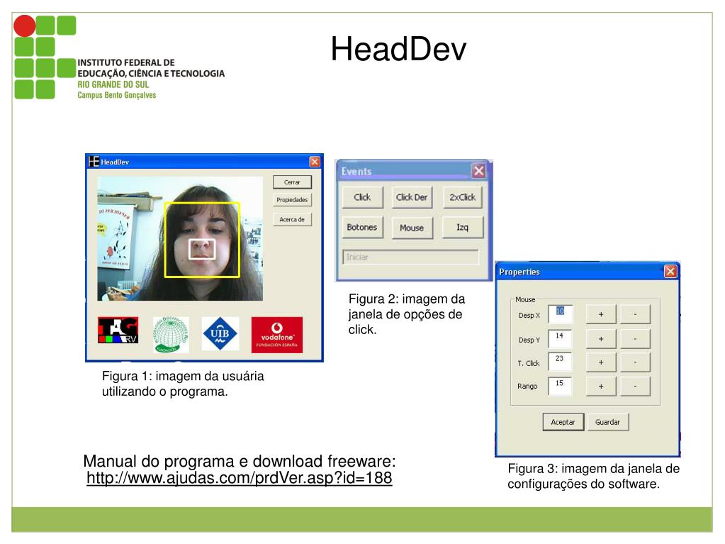 HeadDev HeadDev é um software que é utilizado em conjunto a uma webcam. O software capta a imagem da webcam e identifica o ponto mais próximo da mesma. Neste momento o software passa a utilizar este ponto como mouse. Posicionando a webcam em frente ao rosto o software irá utilizar o nariz como ponto de referência desta forma, conforme o usuário movimenta a cabeça o cursor se movimenta na tela. O software possui também uma janela que fica disponível na área de trabalho com as opções de click simples e duplo, arrastar, selecionar e click esquerdo e direito. Figura 2: imagem da janela de opções de click. Figura 1: imagem da usuária utilizando o programa. Manual do programa e download freeware: http://www.ajudas.com/prdVer.asp?id=188 Figura 3: imagem da janela de configurações do software.