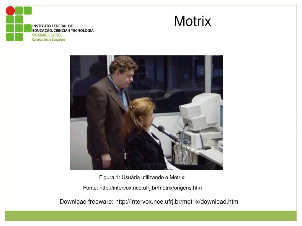 Motrix Este software transforma comandos de voz em ações no computador. Esta ações são: movimentos do cursor, edição de texto, navegação web e etc. Figura 1: Usuária utilizando o Motrix: Fonte: http://intervox.nce.ufrj.br/motrix/origens.htm Download freeware: http://intervox.nce.ufrj.br/motrix/download.htm
