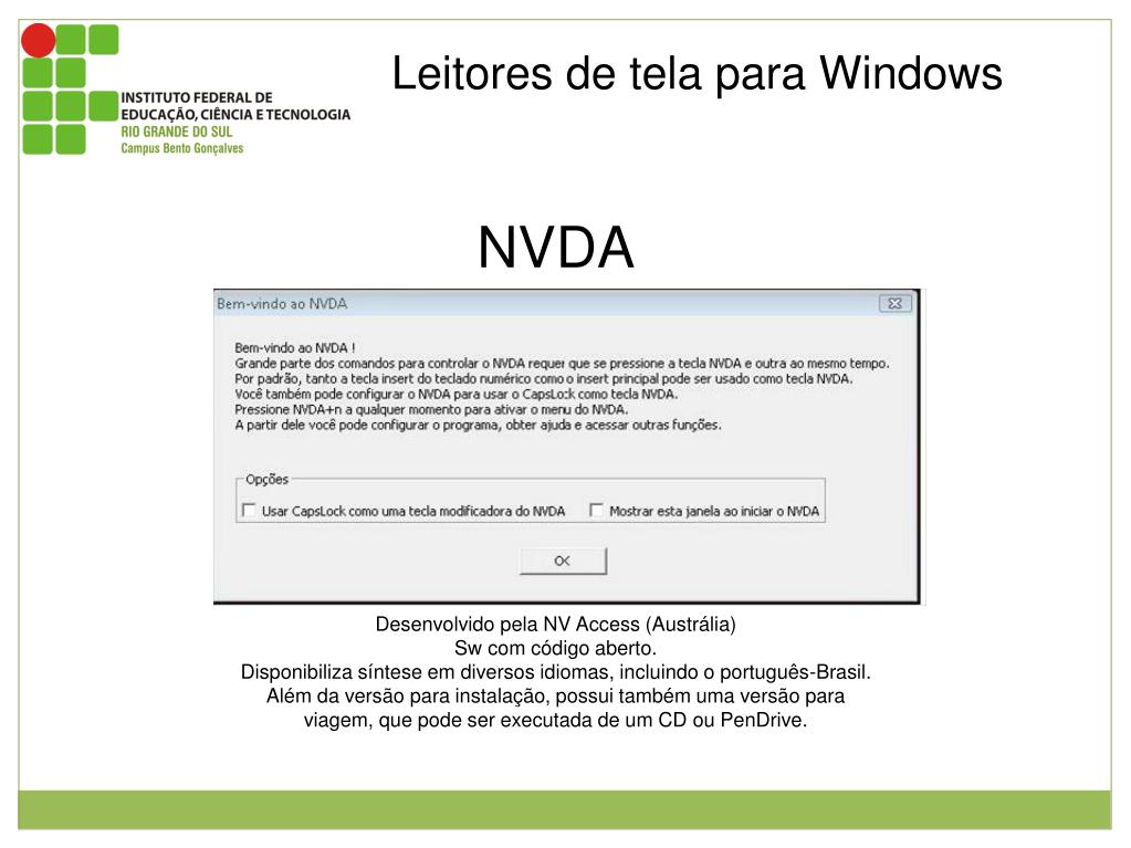 Leitores de tela para Windows NVDA Janela inicial do NVDA Desenvolvido pela NV Access (Austrália) Sw com código aberto. Disponibiliza síntese em diversos idiomas, incluindo o português-Brasil. Além da versão para instalação, possui também uma versão para viagem, que pode ser executada de um CD ou PenDrive.