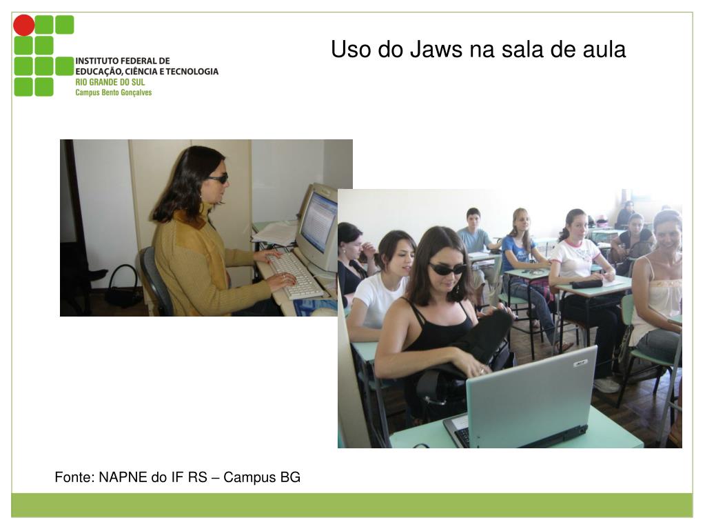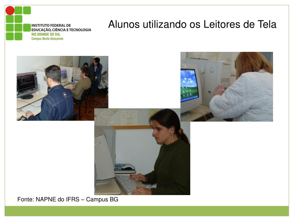 Alunos utilizando os Leitores de Tela Imagem de alunos deficientes visuais utilizando os leitores de tela. Fonte: NAPNE do IFRS – Campus BG