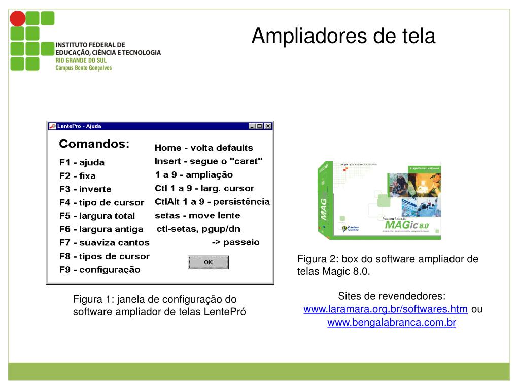 Ampliadores de tela Figura 2: box do software ampliador de telas Magic 8.0. Sites de revendedores: www.laramara.org.br/softwares.htm ou www.bengalabranca.com.br Figura 1: janela de configuração do software ampliador de telas LentePró