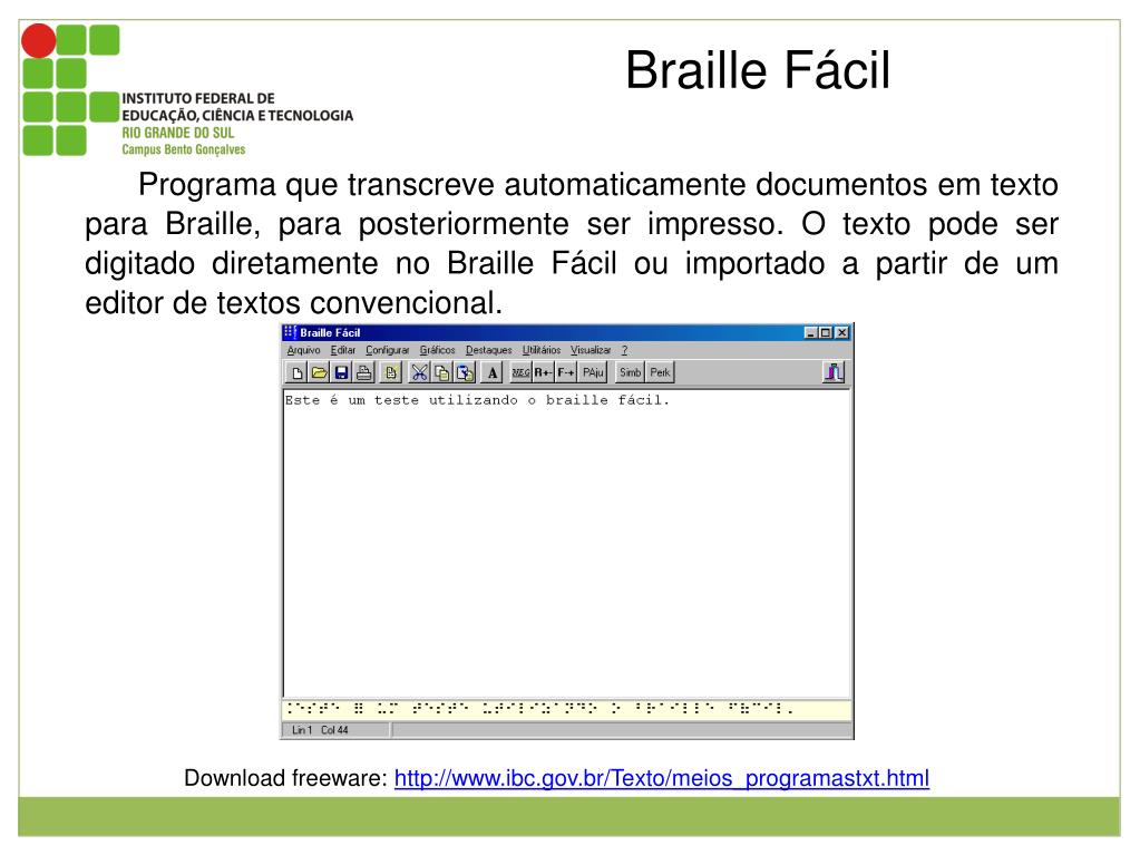 Braille Fácil Programa que transcreve automaticamente documentos em texto para Braille, para posteriormente ser impresso. O texto pode ser digitado diretamente no Braille Fácil ou importado a partir de um editor de textos convencional. Figura 1:Interface de utilização do Braille fácil . Download freeware: http://www.ibc.gov.br/Texto/meios_programastxt.html