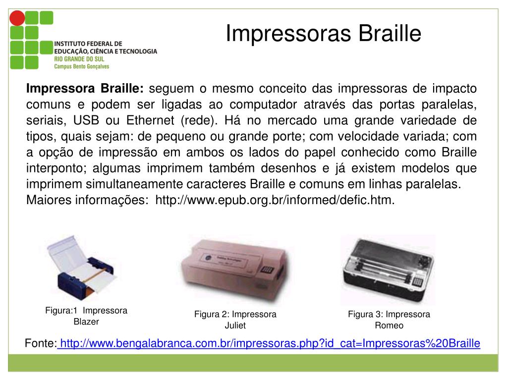 Impressoras Braille Impressora Braille: seguem o mesmo conceito das impressoras de impacto comuns e podem ser ligadas ao computador através das portas paralelas, seriais, USB ou Ethernet (rede). Há no mercado uma grande variedade de tipos, quais sejam: de pequeno ou grande porte; com velocidade variada; com a opção de impressão em ambos os lados do papel conhecido como Braille interponto; algumas imprimem também desenhos e já existem modelos que imprimem simultaneamente caracteres Braille e comuns em linhas paralelas. Maiores informações: http://www.epub.org.br/informed/defic.htm. Figura:1 Impressora Blazer Figura 2: Impressora Juliet Figura 3: Impressora Romeo Fonte: http://www.bengalabranca.com.br/impressoras.php?id_cat=Impressoras%20Braille