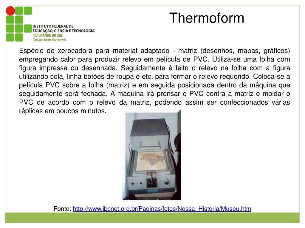 Thermoform Espécie de xerocadora para material adaptado - matriz (desenhos, mapas, gráficos) empregando calor para produzir relevo em película de PVC. Utiliza-se uma folha com figura impressa ou desenhada. Seguidamente é feito o relevo na folha com a figura utilizando cola, linha botões de roupa e etc, para formar o relevo requerido. Coloca-se a película PVC sobre a folha (matriz) e em seguida posicionada dentro da máquina que seguidamente será fechada. A máquina irá prensar o PVC contra a matriz e moldar o PVC de acordo com o relevo da matriz, podendo assim ser confeccionados várias réplicas em poucos minutos. Imagem da máquina termoform criando relevo em mapa do Brasil. Fonte: http://www.ibcnet.org.br/Paginas/fotos/Nossa_Historia/Museu.htm