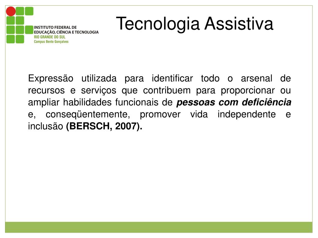 Tecnologia Assistiva Expressão utilizada para identificar todo o arsenal de recursos e serviços que contribuem para proporcionar ou ampliar habilidades funcionais de pessoas com deficiênciae, conseqüentemente, promover vida independente e inclusão (BERSCH, 2007).