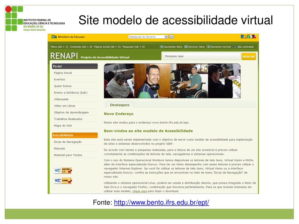 Site modelo de acessibilidade virtual Imagem da página inicial do site modelo RENAPI – Bento Gonçalves RS. Neste encontram-se material de apoio e manuais de softwares e equipamentos. Fonte:http://www.bento.ifrs.edu.br/ept/