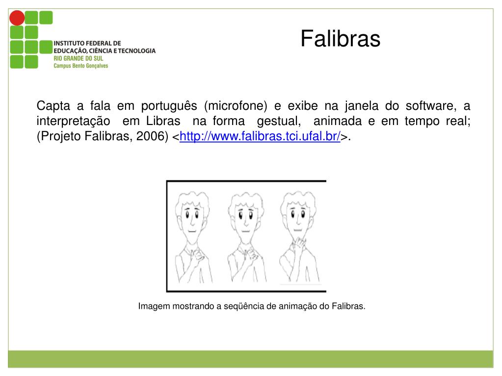 Falibras Capta a fala em português (microfone) e exibe na janela do software, a interpretação em Libras na forma gestual, animada e em tempo real; (Projeto Falibras, 2006) <http://www.falibras.tci.ufal.br/>. Imagem mostrando a seqüência de animação do Falibras. Esta possui um personagem que reproduz a linguagem de sinais.