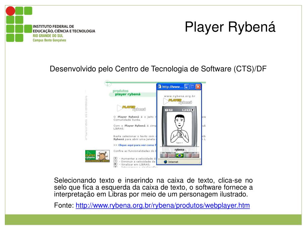 Player Rybená Desenvolvido pelo Centro de Tecnologia de Software (CTS)/DF Imagem da página inicial do Player Rybená e janela mostrando a interpretação em libras. Selecionando texto e inserindo na caixa de texto, clica-se no selo que fica a esquerda da caixa de texto, o software fornece a interpretação em Libras por meio de um personagem ilustrado. Fonte: http://www.rybena.org.br/rybena/produtos/webplayer.htm