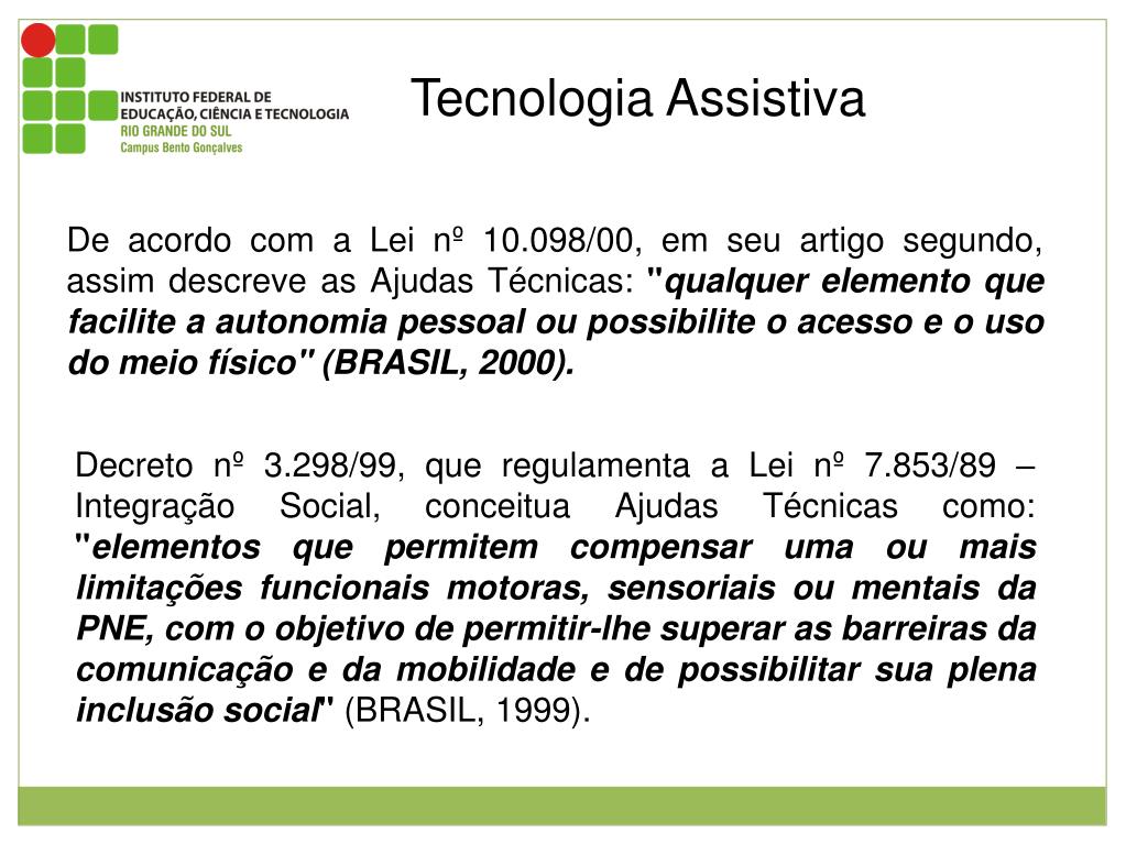 Tecnologia Assistiva De acordo com a Lei nº 10.098/00, em seu artigo segundo, assim descreve as Ajudas Técnicas: "qualquer elemento que facilite a autonomia pessoal ou possibilite o acesso e o uso do meio físico" (BRASIL, 2000). Decreto nº 3.298/99, que regulamenta a Lei nº 7.853/89 – Integração Social, conceitua Ajudas Técnicas como: "elementos que permitem compensar uma ou mais limitações funcionais motoras, sensoriais ou mentais da PNE, com o objetivo de permitir-lhe superar as barreiras da comunicação e da mobilidade e de possibilitar sua plena inclusão social" (BRASIL, 1999).