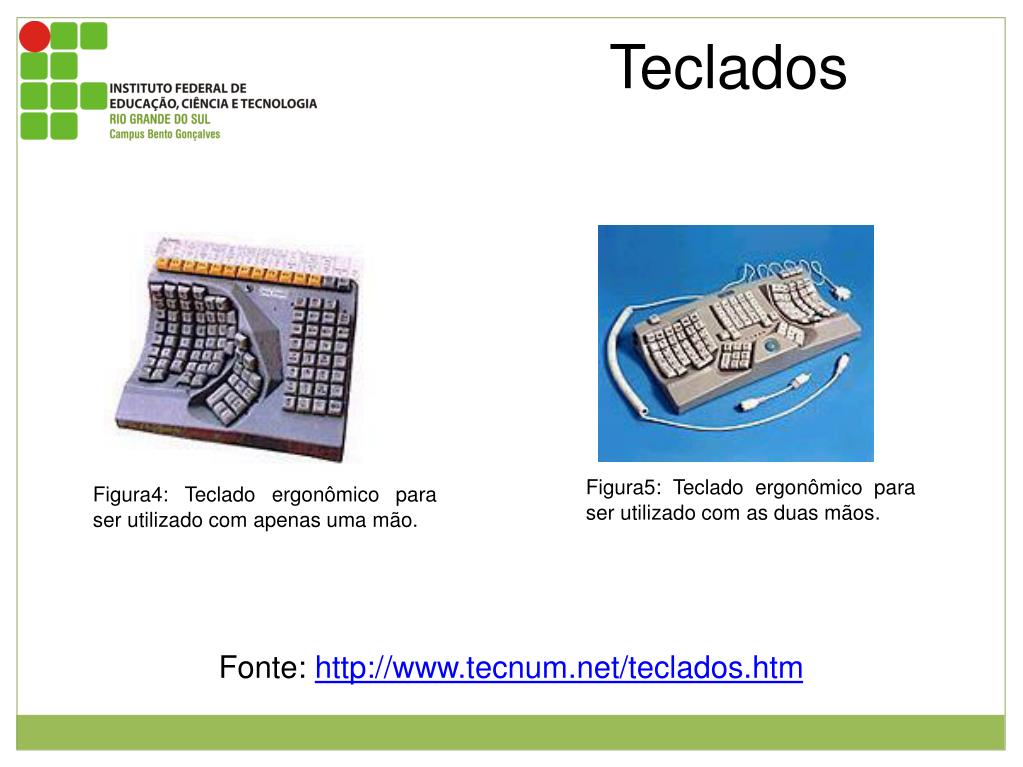 Teclados Figura5: Teclado ergonômico para ser utilizado com as duas mãos. Figura4: Teclado ergonômico para ser utilizado com apenas uma mão. Fonte: http://www.tecnum.net/teclados.htm