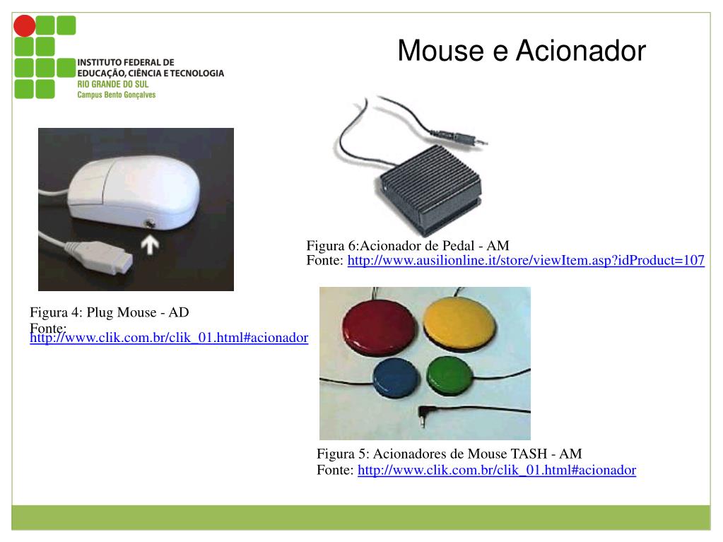 Mouse e Acionador Figura 6:Acionador de Pedal - AM Fonte: http://www.ausilionline.it/store/viewItem.asp?idProduct=107 O propósito deste é substituir o click como os sitados anteriormentes porém é indicado para o uso com os pés. Figura 4: Plug Mouse - AD Fonte: http://www.clik.com.br/clik_01.html#acionador Mouse tadicional com adaptador para receber um switch . Figura 5: Acionadores de Mouse TASH - AM Fonte: http://www.clik.com.br/clik_01.html#acionador Acionador switch com a mesma finalidade dos switch da figura 1 porém no formato redondo.É possível encontrar em tamanhos grande e pequeno, o tamanho pequeno tem o raio de 3 centímetros e o grande com 8 centímetros de raio.