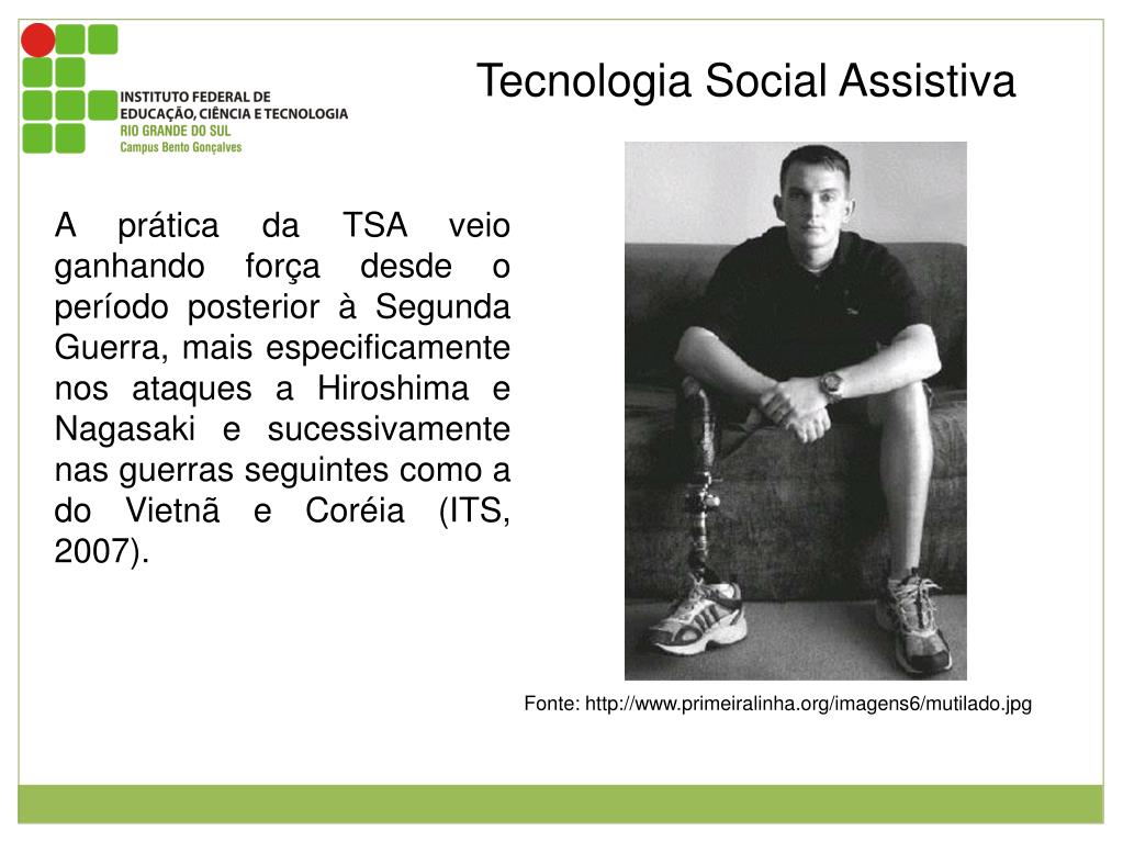 Tecnologia Social Assistiva A prática da TSA veio ganhando força desde o período posterior à Segunda Guerra, mais especificamente nos ataques a Hiroshima e Nagasaki e sucessivamente nas guerras seguintes como a do Vietnã e Coréia (ITS, 2007). Figura 1: soldado norte-americano a paisano sentado em sofá com sua perna mecânica a mostra. Fonte: http://www.primeiralinha.org/imagens6/mutilado.jpg