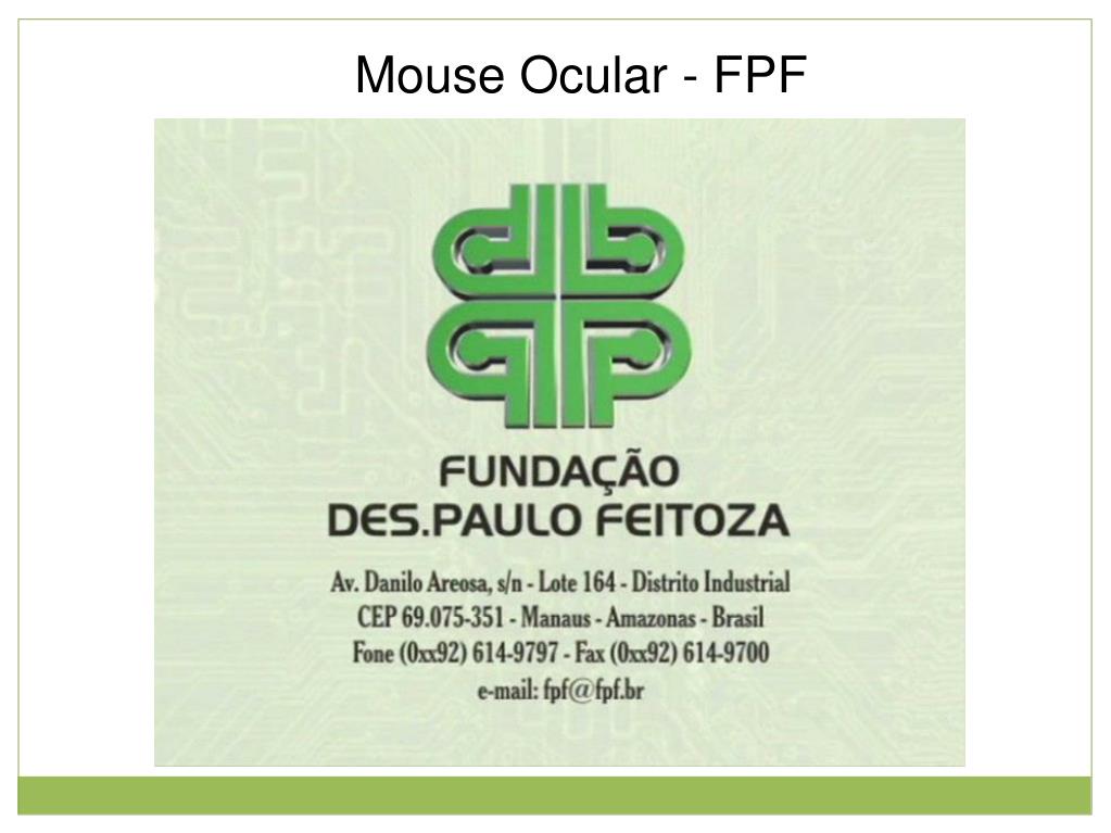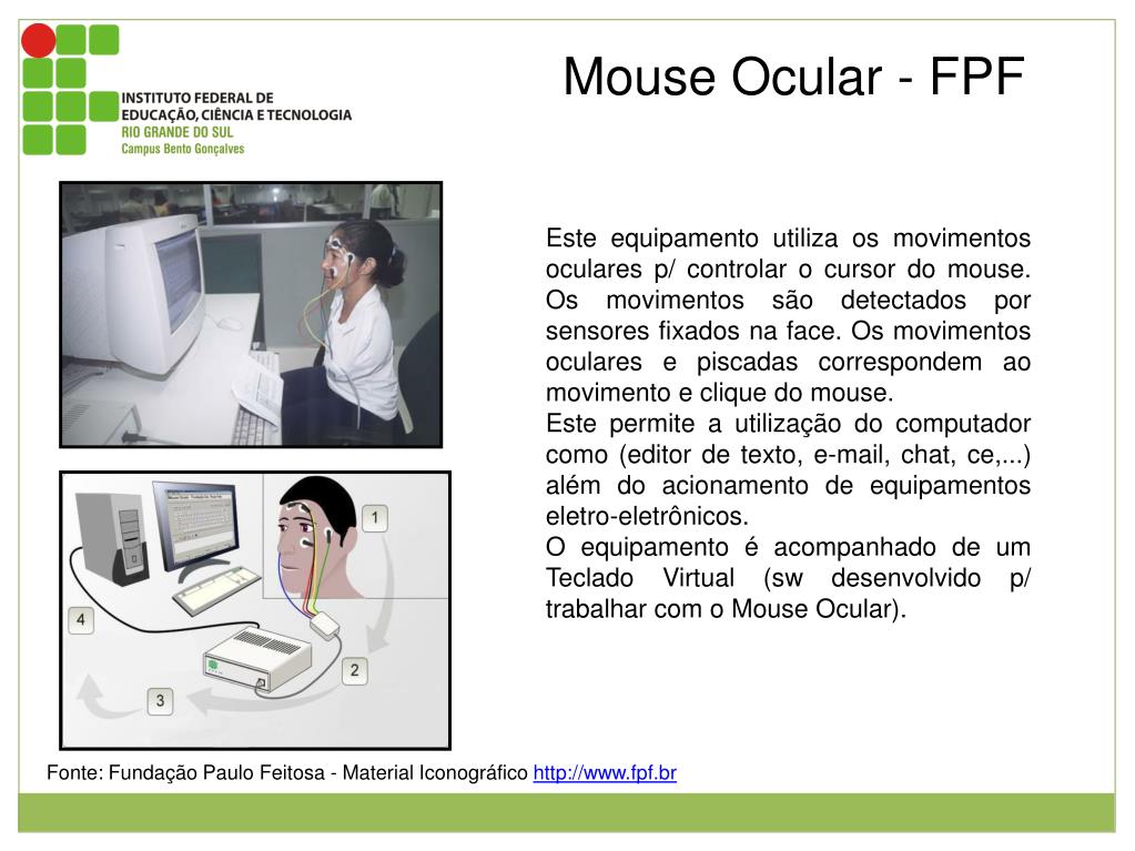Mouse Ocular - FPF Este equipamento utiliza os movimentos oculares p/ controlar o cursor do mouse. Os movimentos são detectados por sensores fixados na face. Os movimentos oculares e piscadas correspondem ao movimento e clique do mouse. Este permite a utilização do computador como (editor de texto, e-mail, chat, ce,...) além do acionamento de equipamentos eletro-eletrônicos. O equipamento é acompanhado de um Teclado Virtual (sw desenvolvido p/ trabalhar com o Mouse Ocular). Figura 1: Usuária desprovida dos braços sentada em frente ao computador com os eletrodos fixados no rosto. Figura 2: Imagem ilustrativa da utilização do mouse ocular. Esta possui o desenho do rosto de uma pessoa com os eletrodos conectados em sua face que por sua vez estão conectados a um equipamento conectado ao computador. Fonte: Fundação Paulo Feitosa - Material Iconográfico http://www.fpf.br