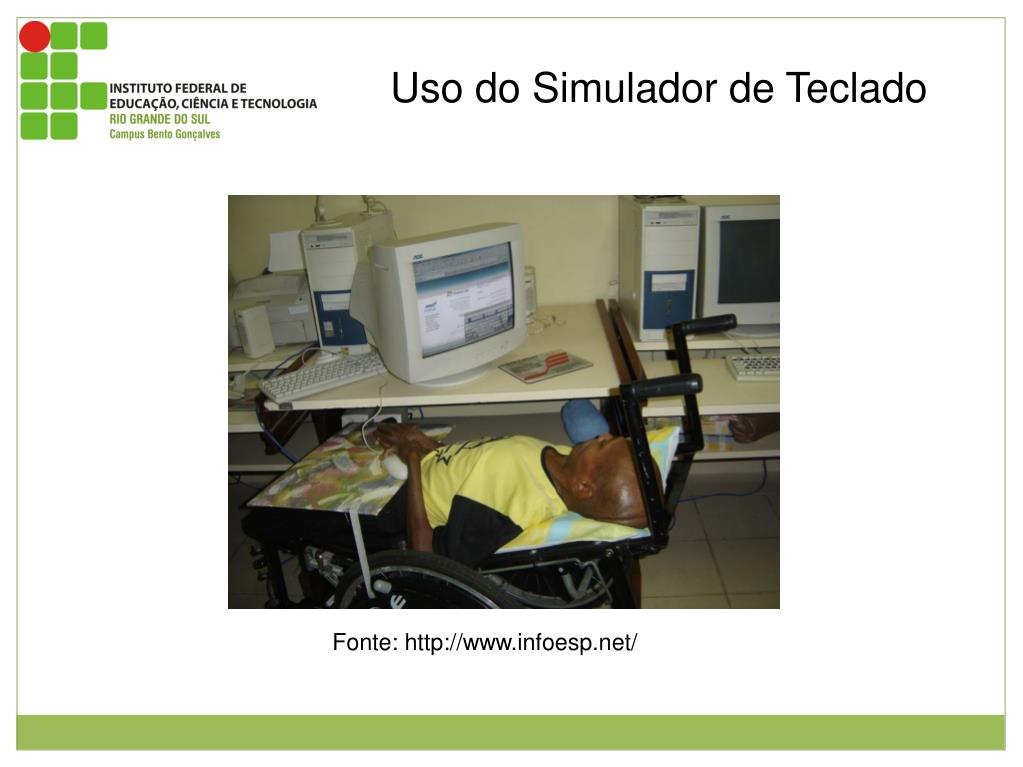 Uso do Simulador de Teclado Figura 1: usuário com deficiência motora deitado em cadeira de rodas voltado para monitor utilizando teclado virtual em concomitante ao acionador de click. Fonte: http://www.infoesp.net/