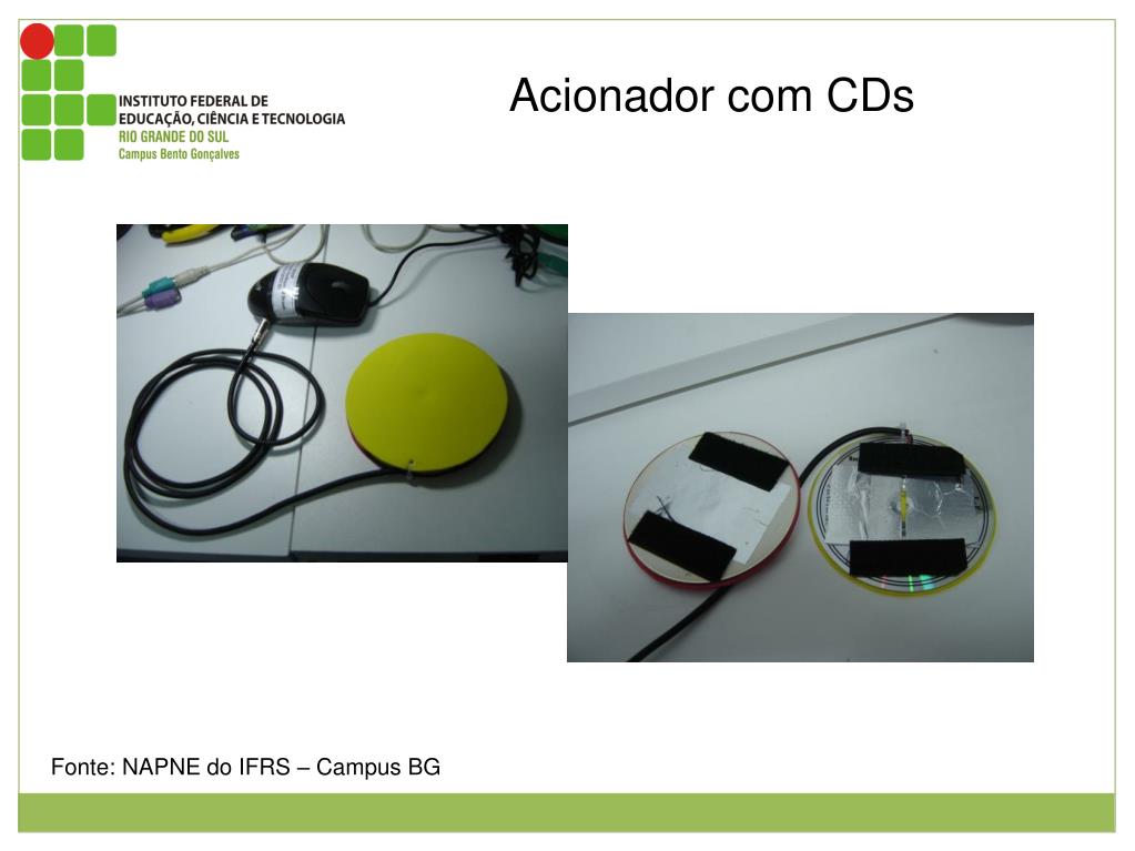 Acionador com CDs Este artefato foi construído com 2 CDs unidos por tiras de velcro. O acionador com CDs tem o mesmo objetivo do acionador tradicional industrializado apresentado anteriormente. Figura 1:Acionador com CDs na cor amarela conectado ao mouse. Figura 2: Acionador aberto mostrando os terminais feitos com papel alumínio colados no s CDs . Os CDs foram unidos com velcro. Fonte: NAPNE do IFRS – Campus BG