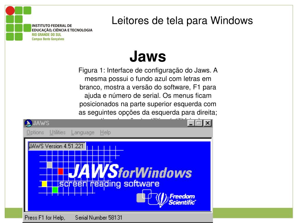 Leitores de tela para Windows Jaws Figura 1: Interface de configuração do Jaws. A mesma possui o fundo azul com letras em branco, mostra a versão do software, F1 para ajuda e número de serial. Os menus ficam posicionados na parte superior esquerda com as seguintes opções da esquerda para direita; options (opções), utilities (utilitários), languagem (linguagem) e help (ajuda).