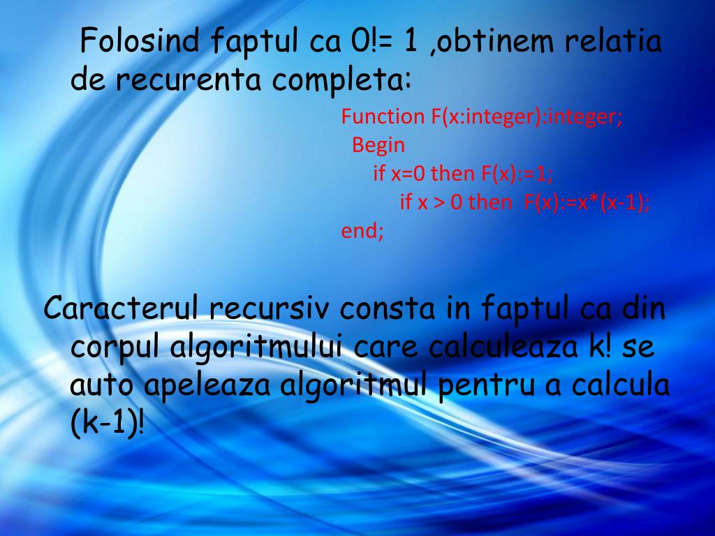 Function F(x:integer):integer; Begin if x=0 then F(x):=1; if x > 0 then F(x):=x*(x-1);end; Folosind faptul ca 0!= 1 ,obtinem relatia de recurenta completa: Caracterul recursiv consta in faptul ca din corpul algoritmului care calculeaza k! se auto apeleaza algoritmul pentru a calcula (k-1)!