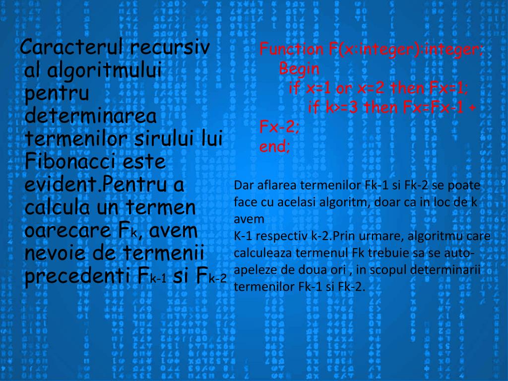 Function F(x:integer):integer; Begin if x=1 or x=2 then Fx=1; if k>=3 then Fx=Fx-1 + Fx-2;end; Caracterulrecursiv al algoritmuluipentrudeterminareatermenilorsiruluilui Fibonacci esteevident.Pentru a calcula un termenoarecareFk, avemnevoie de termeniiprecedenti Fk-1si Fk-2 Dar aflarea termenilor Fk-1 si Fk-2 se poate face cu acelasi algoritm, doar ca in loc de k avem K-1 respectiv k-2.Prin urmare, algoritmu care calculeaza termenul Fk trebuie sa se auto- apeleze de doua ori , in scopul determinarii termenilor Fk-1 si Fk-2.