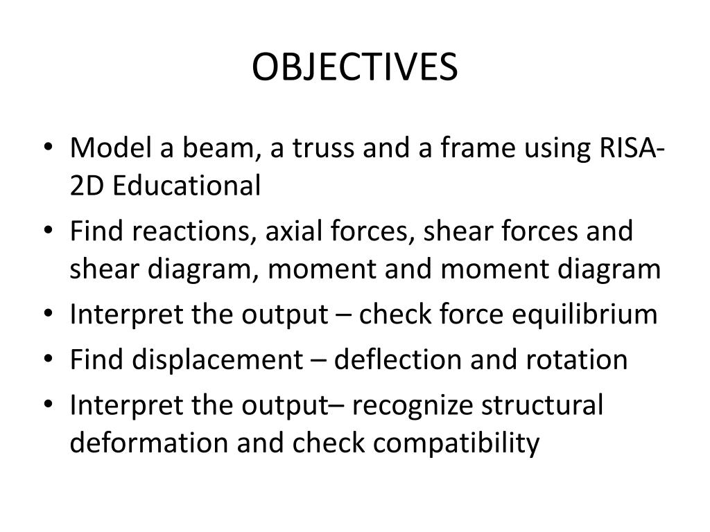 OBJECTIVES • Model a beam, a truss and a frame using RISA-2D Educational • Find reactions, axial forces, shear forces and shear diagram, moment and moment diagram • Interpret the output – check force equilibrium • Find displacement – deflection and rotation • Interpret the output– recognize structural deformation and check compatibility