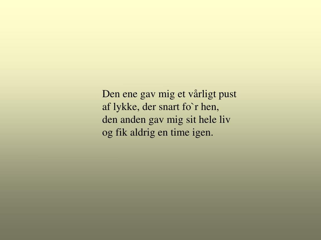 Den ene gav mig et vårligt pust af lykke, der snart fo`r hen, den anden gav mig sit hele liv og fik aldrig en time igen.