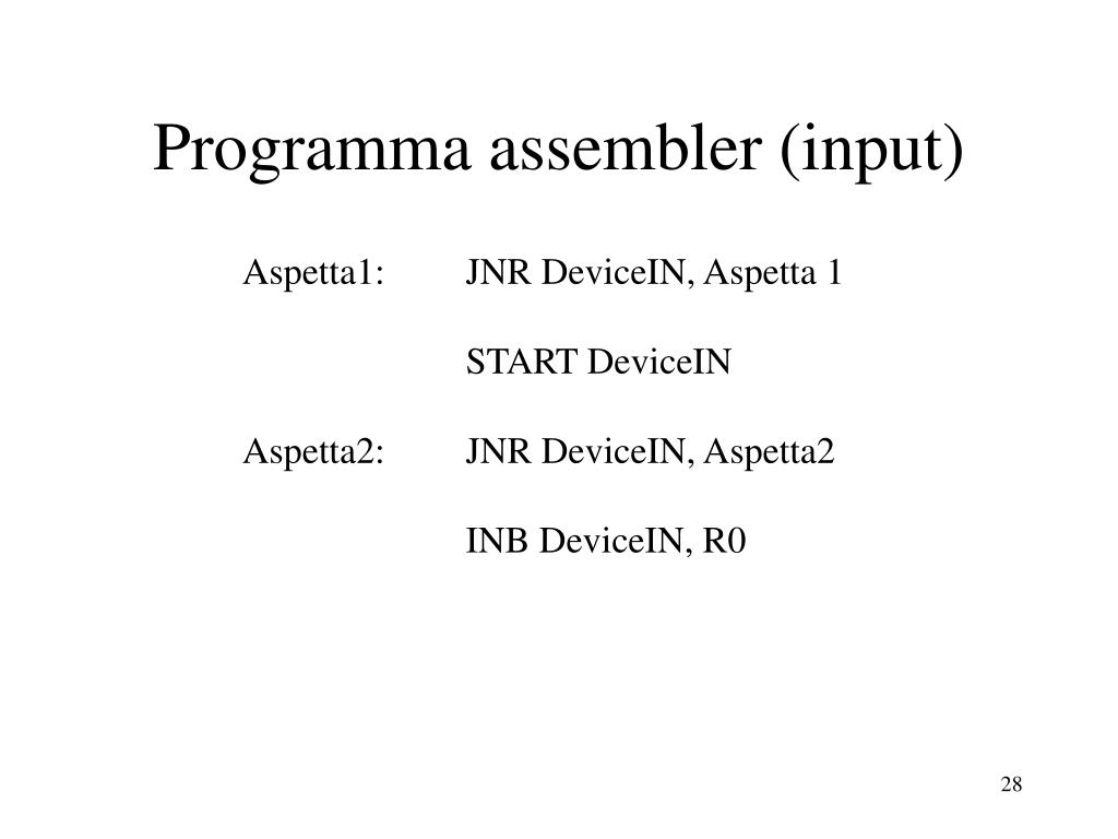 Programma assembler (input) Aspetta1: JNR DeviceIN, Aspetta 1 START DeviceIN Aspetta2: JNR DeviceIN, Aspetta2 INB DeviceIN, R0