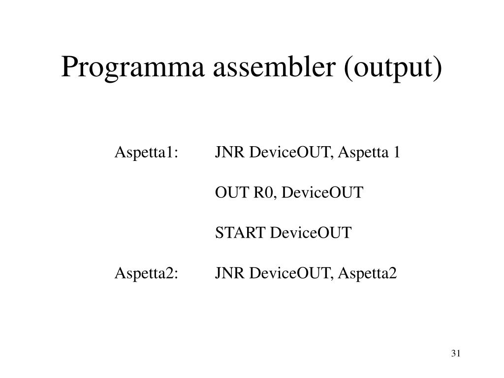Programma assembler (output) Aspetta1: JNR DeviceOUT, Aspetta 1 OUT R0, DeviceOUT START DeviceOUT Aspetta2: JNR DeviceOUT, Aspetta2