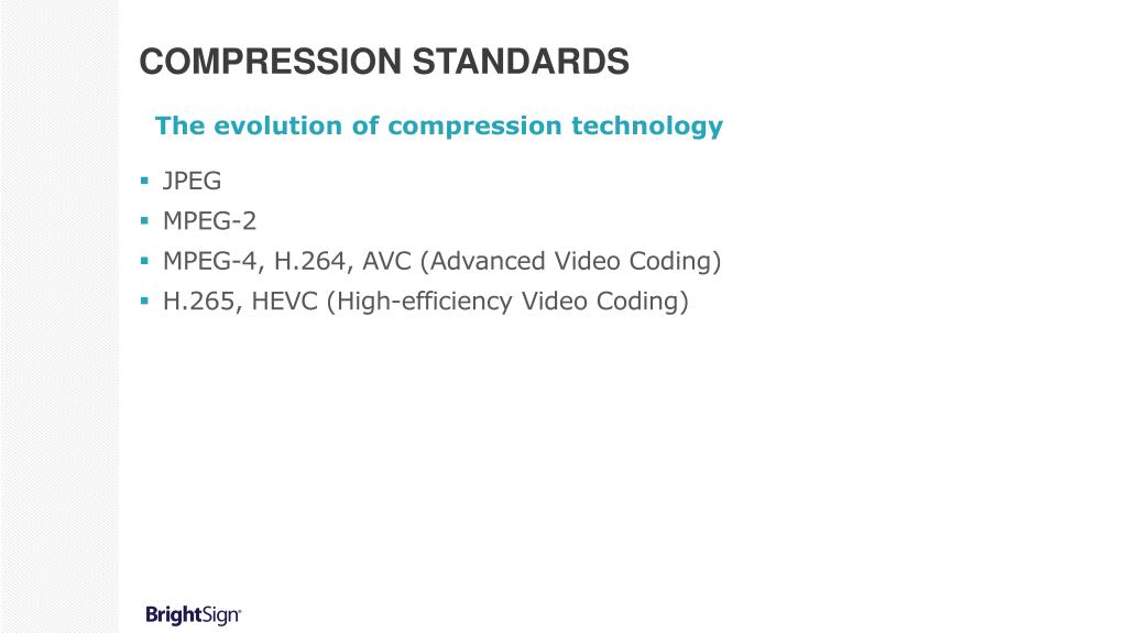 compression standards The evolution of compression technology JPEG MPEG-2 MPEG-4, H.264, AVC (Advanced Video Coding) H.265, HEVC (High-efficiency Video Coding)