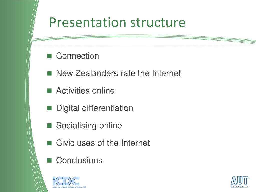 Presentation structure • Connection • New Zealanders rate the Internet • Activities online • Digital differentiation • Socialising online • Civic uses of the Internet • Conclusions