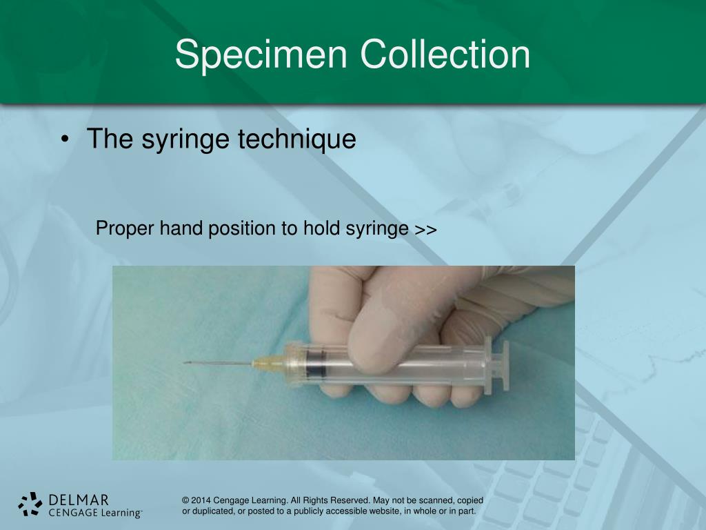 Specimen Collection • The syringe technique Proper hand position to hold syringe >>