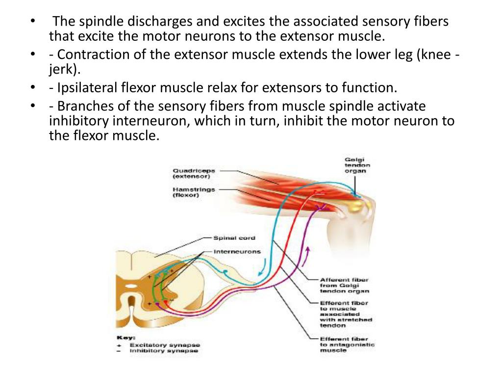 The spindle discharges and excites the associated sensory fibers that excite the motor neurons to the extensor muscle. • - Contraction of the extensor muscle extends the lower leg (knee - jerk). • - Ipsilateral flexor muscle relax for extensors to function. • - Branches of the sensory fibers from muscle spindle activate inhibitory interneuron, which in turn, inhibit the motor neuron to the flexor muscle.